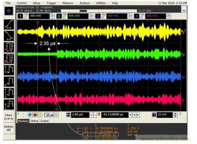 圖7 使用寬帶多通道示波器測量天線通道 0 和 1 之間的定時誤差