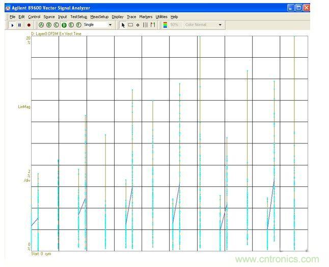 然而,EVM峰值較高(43%),所以需要對誤差矢量頻譜(EVM vs. 子載波)和誤差矢量時間(EVM vs. 符號)進行評測,以得出復合EVM結果。這揭示了參考信號的符號間變化,因此將 VSA 上的下行鏈路文件修改為只顯示參考信號,如圖5所示。