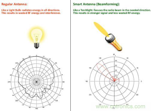 普通天線(方向性弱)和智能天線陣列(方向性強)