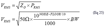 其中PSIG為振蕩器的輸出功率。例如,某個(gè)振蕩器在50Ω產(chǎn)生的功率為10dBm,輸出相位噪聲底為-150dBc/Hz、有效帶寬為100MHz, 則輸出噪聲電壓為224mVRMS: