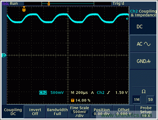 第二組試驗(yàn)中,MAX1472發(fā)送器從MAX1947消耗功率時(shí),利用示波器記錄MAX1947輸出電源的紋波電壓。