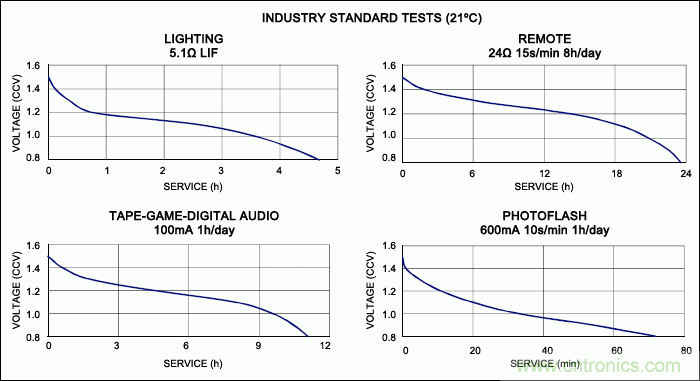 圖6. Energizer E92 AAA電池的行業(yè)標(biāo)準(zhǔn)電池壽命測(cè)試數(shù)據(jù)。