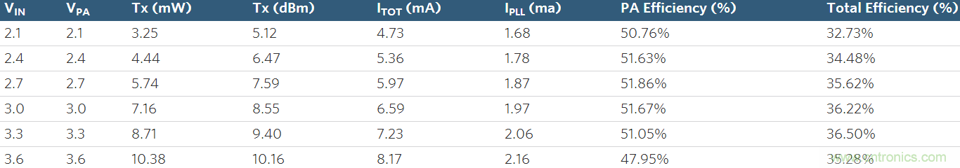 表4格式與表1、表2和表3相同。表中將MAX7060的發(fā)射功率、電流損耗作為電池電壓的函數(shù)列出。MAX7060的Tx功率設(shè)置固定在最大功率以下2dB。該設(shè)置保證電池從2.4升至3.6V時(shí),功率接近恒定(下降1dB以內(nèi)),電壓下降至2.1V時(shí),額外損失1dB。