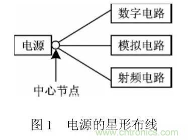 星形布線是模擬電路設(shè)計(jì)中眾所周知的技巧(如圖1所示) 。星形布線———電路板上各模塊具有各自的來(lái)自公共供電電源點(diǎn)的電源線路。在這種情況下,星形布線意味著電路的數(shù)字部分和RF 部分應(yīng)有各自的電源線路,這些電源線應(yīng)在靠近IC 處分別去耦。這是一個(gè)隔開來(lái)自數(shù)字