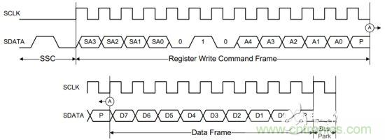 RFFE定義了很多種類的命令序列,來對總線上的設備進行讀/寫操作。每一條命令都包含:開始序列(SSC),命令序列(Command Frame)和數(shù)據(jù)序列Data Frame,如圖2為寄存器寫指令的時序。