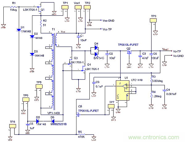 圖6:低靜態(tài)電流JFET升壓轉(zhuǎn)換器。