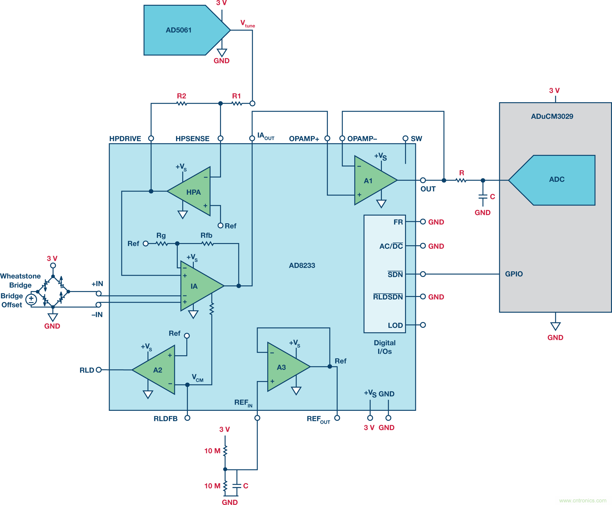 基于Wheatstone電橋的壓力傳感器應(yīng)用就是適合采用固定增益100和圖4失調(diào)校正電路的一個(gè)好例子。此電橋可自然地將輸入共模電壓設(shè)為+Vs/2。電橋可由REFOUT或非專用運(yùn)算放大器驅(qū)動(dòng)(具體取決于測量范圍和所需電流),使得電橋的電源電流在關(guān)斷模式下被禁用。圖7顯示的是一個(gè)示例電路。由于 AD5601 DAC具有低功耗(在3 V下為60 uA)、關(guān)斷引腳和小巧的SC70封裝,因此對(duì)于校正電橋和IA失調(diào)是一個(gè)不錯(cuò)的選擇。運(yùn)算放大器(A1)留作占位緩沖器,可用來設(shè)置附加增益/噪聲濾波和60 Hz帶寬。輸出放大器驅(qū)動(dòng)超低功耗ARM® Cortex®-M3 (ADuCM3029)的片上ADC,ADuCM3029采用節(jié)省空間的WLCSP封裝。ADuCM3029的GPIO可以控制AD8233的關(guān)斷引腳。