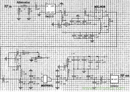 (3) 第一級放大器選用Gali-5單片放大器,Gali系列封裝體積小,匹配網(wǎng)絡(luò)簡單方便,可靠性高,器件的線性度很好,它可以提供19dB左右的功率增益;第二級選用MHL9838集成功率放大芯片,該芯片內(nèi)部集成了匹配網(wǎng)絡(luò),因此設(shè)計簡便,可靠性也非常高,用做推動放大級性能十分理想,該模塊可以提供31dB左右的功率增益。