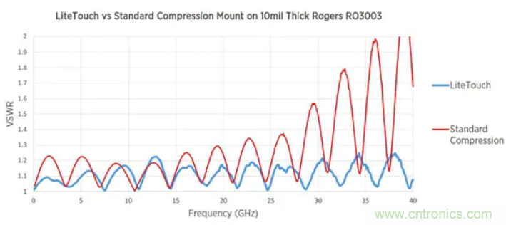 圖2顯示了使用頻率可以超過30GHz的標準壓縮連接器對駐波比(VSWR)反射的影響,見紅色曲線。相比之下,通過藍色曲線可以看出,在使用Amphenol SV Microwave LiteTouch連接器時,反射的增加幅度最小。