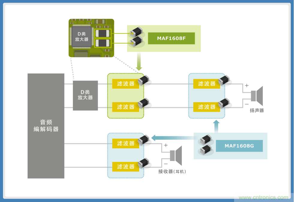 以下就音頻線路噪音濾波器MAF系列的優(yōu)異特性以及運(yùn)用示例進(jìn)行具體說(shuō)明。圖3是將MAF1608F與MAF1608G用于揚(yáng)聲器線,將MAF1608G用于接收器(耳機(jī))線時(shí)的方框圖。