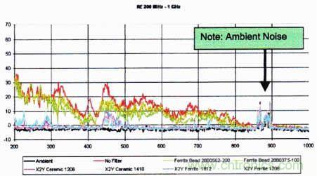 圖27單板機沒有濾波器、磁珠、帶磁珠BDL、BDL的輻射(200MHz~1`GHz)對比