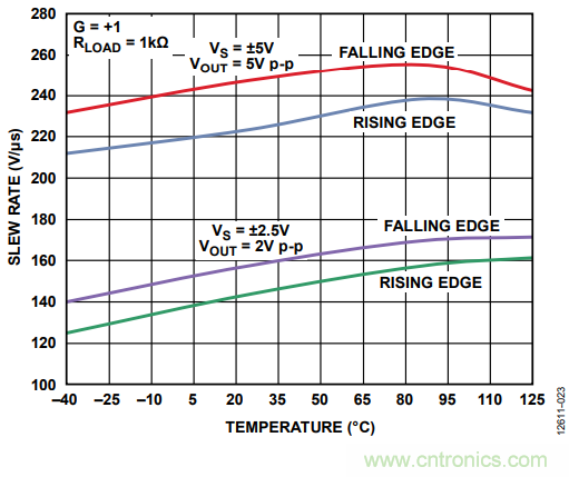 影響壓擺率的另一因素是溫度,半導(dǎo)體器件參數(shù)的性能與工作溫度相關(guān)。在放大器數(shù)據(jù)手冊中會提供壓擺率與溫度示意圖,通常壓擺率隨著溫度上升而在一定范圍內(nèi)增加,如圖 2.129 為 ADA4807 壓擺率與溫度示意圖。