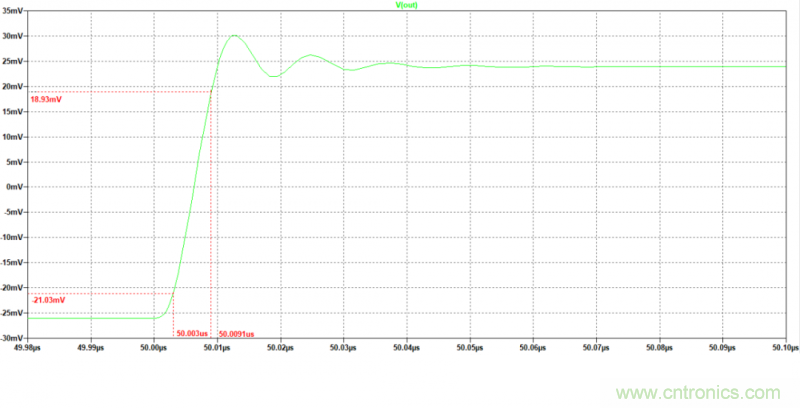 在 50.003μs 時 ADA4807 的輸出電壓為 -21.03mV,在 50.00091μs 時,ADA4807 的輸出電壓為+18.93mV,由此可得: