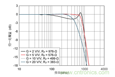 圖4:電流反饋運算放大器的增益和帶寬關(guān)系
