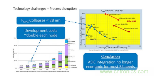 圖3也顯示了最小幾何門尺寸和最大器件振蕩頻率之間的相關性。如圖所示,F(xiàn)max的拐點在門長度<28nm的位置。相應的,隨著門長度的減小,開發(fā)成本呈指數(shù)增長(G=28nm(平均開發(fā)成本5130萬美元),G=16nm(平均開發(fā)成本1.063億美元),G=7nm(成本2.97億美元),G=5nm(成本超過5億美元))。隨著SoC包含更多的功能,需要使用更小的門長度,其開發(fā)的成本變得令人望而卻步。例如,SoC一直是移動電話行業(yè)的驅動技術,但對模擬技術(如MEMS傳感器)的需求不斷增加,導致從SoC到SiP方案的變革。圖4說明了當前推進從SoC到SiP的變革的三個共存的設計參數(shù):1)技術:為最優(yōu)系統(tǒng)性能選擇最合適的工藝技術(即Si、GaAs、GaN、SiGe等),2)小型化,3)成本。