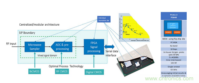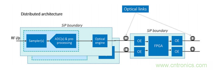 例如,圖6的PS640是一款SiP實現(xiàn)的RF數(shù)據(jù)轉換系統(tǒng)產(chǎn)品,目前正在研發(fā),用于未來的L波段到Ka波段的頻率接收機(1GHz至40GHz)。PS640使用Teledyne e2v基于STMicro BiCMOS055工藝設計的新型THA和兩片互相交織的EV12AQ600 ADC,是一款“集中式”的高速SiP數(shù)據(jù)轉換接收器(Rx)。圖6也描述了其性能指標。圖7描述了一種相同的數(shù)據(jù)轉換系統(tǒng)的未來概念,這是一種“分布式”數(shù)據(jù)轉換接收器的實現(xiàn)方式,使用光引擎(包含在SiP中)驅動數(shù)字處理器(FPGA),實現(xiàn)最大軟件化(軟件中心)。