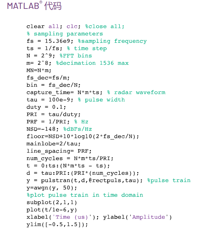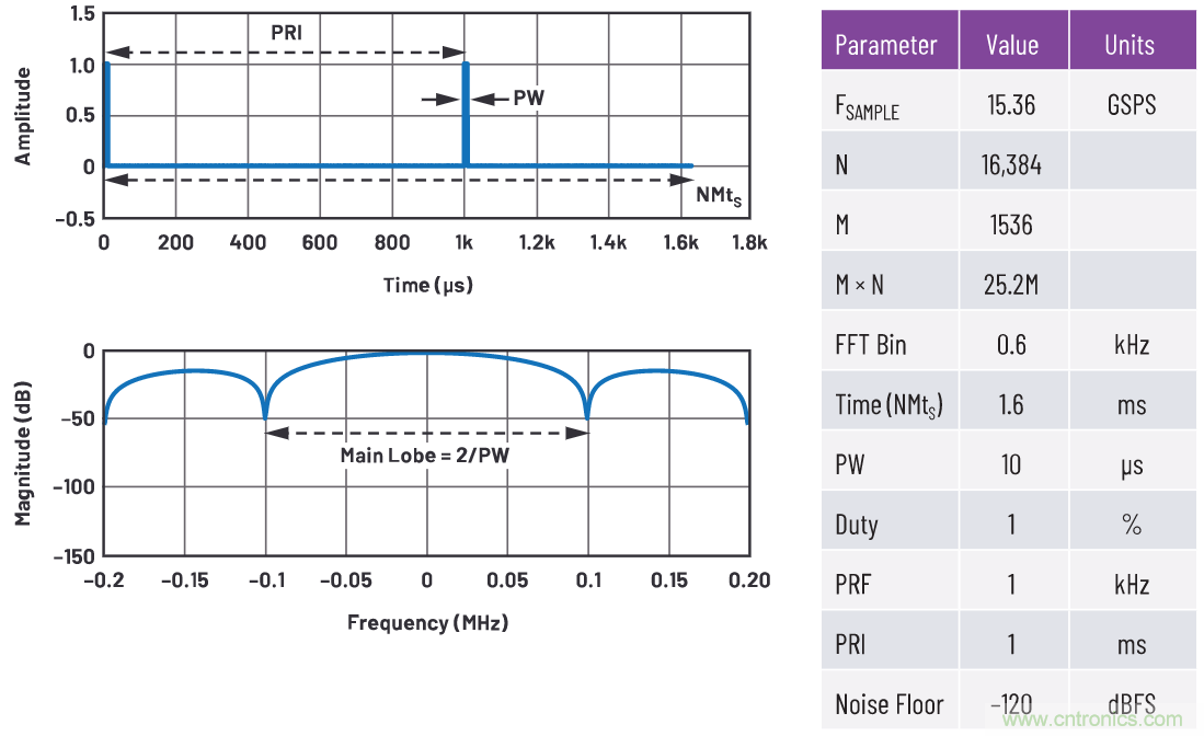 這里給出了兩個脈沖序列示例。第一個代表脈沖多普勒雷達,其在10%的占空比時顯示出非常短的PW (100 ns),導(dǎo)致PRF非常高。第二個模擬脈沖雷達,其PW和PRI相對較長(占空比較低,PRF較低)。下面的圖像和表格說明了抽取M和FFT長度N對時間、靈敏度(本底噪聲)和頻譜分辨率的影響。表1匯總了這些參數(shù)以便于比較。虛構(gòu)的值并不代表具體的雷達,但仍有實際意義10。