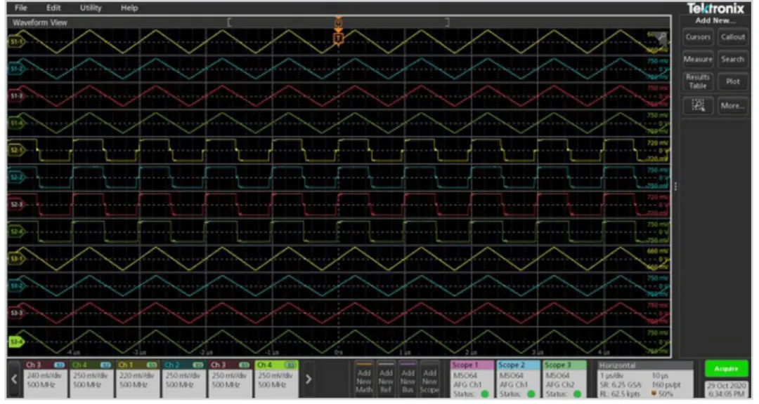 TekScope PC軟件還允許您在同一屏幕上查看和分析來自多個示波器的數(shù)據(jù)、重新排列通道信息、堆疊組、縮放,以及在無縫界面中添加光標或測量值。該功能最多可支持四臺示波器和 32 個通道。多示波器分析解決方案使您能夠同時遠程控制所有示波器的采集設置,而無需對每個示波器進行單獨設置。一旦在 TekScope PC 軟件上采集到數(shù)據(jù),您就可以同時對不同示波器的所有通道進行測量和數(shù)據(jù)分析。