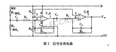 信號采集電路中的InSb-In薄膜磁阻元件采用三端差分型接法如圖1(b)所示,這種信號采集電路具有輸出信號較大和較強(qiáng)抑制溫漂的能力。信號處理電路采用阻容耦合型差動放大電路,在圖2中IC1和IC2為兩級差動放大,改變R2,R7,R5,R8的阻值可以調(diào)整放大倍數(shù)。集成運(yùn)放的靜態(tài)電壓由R3和R6來調(diào)節(jié),考慮到通常磁頭內(nèi)的上、下兩個磁阻元件不完全平衡,MR1與MR2的阻值會有10%以內(nèi)的差別,在+5 V的工作電源下,信號采集的輸出端電壓在2.4~2.6 V。為了減少信號在磁頭與運(yùn)放之間阻容耦合中的損失,一般把集成運(yùn)放靜態(tài)電壓設(shè)置為低于2.5 V,取2 V比較合適。
