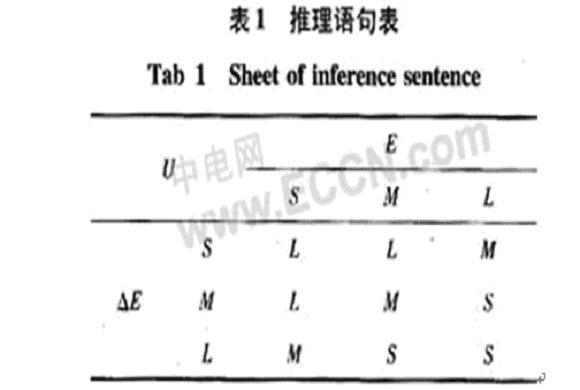 基于神經(jīng)網(wǎng)絡(luò)在推理方面不足,故借助于模糊控制強(qiáng)大的推理功能,提取有效的條件語句,進(jìn)而加快網(wǎng)絡(luò)的訓(xùn)練速度。選取偏差E和偏差變化率△E作為輸入和控制量U作為輸出。偏差E和偏差變化率△E的模糊量分別為大(L),中(M),小(S),創(chuàng)立描述條件推理表格如表1。