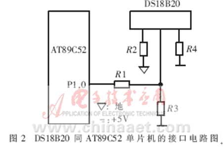 DS18B20的測(cè)溫原理為:內(nèi)部計(jì)數(shù)器對(duì)一個(gè)受溫度影響的振蕩器的脈沖計(jì)數(shù),低溫時(shí)振蕩器的脈沖可以通過(guò)門電路,而當(dāng)?shù)竭_(dá)某一設(shè)置高溫時(shí),振蕩器的脈沖無(wú)法通過(guò)門電路。計(jì)數(shù)器設(shè)置為-55℃時(shí)的值,如果計(jì)數(shù)器到達(dá)0之前門電路未關(guān)閉,則溫度寄存器的值將增加,這表示當(dāng)前溫度高于-55℃。同時(shí),計(jì)數(shù)器復(fù)位在當(dāng)前溫度值上,電路對(duì)振蕩器的溫度系數(shù)進(jìn)行補(bǔ)償,計(jì)數(shù)器重新開始計(jì)數(shù)直到回零。如果門電路仍然未關(guān)閉,則重復(fù)以上過(guò)程。溫度轉(zhuǎn)換所需時(shí)間不超過(guò)750ms,得到的溫度值的位數(shù)因分辨率不同而不同[2]。DS18B20同AT89C52單片機(jī)的接口電路如圖2所示。這種接口方式只需占用單片機(jī)一根口線,與智能儀器或智能測(cè)控系統(tǒng)中的其它單片機(jī)或DSP的接口也可采用類似的方式。