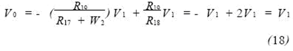 當(dāng)輸入電壓Vi 為負(fù)半周期時(shí),經(jīng)A4反相,D2導(dǎo)通,D3截至,A4輸出為零,經(jīng)R17,W2送來的A5的輸入信號(hào)為V1,另一路經(jīng)A5輸入信號(hào)為V1,則輸出信號(hào)V0為: