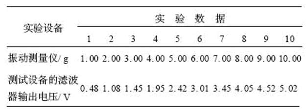實(shí)驗(yàn)設(shè)備:ZD-1型振動(dòng)臺(tái)一臺(tái),其頻響10~20kHz。9102型測振傳感器一個(gè),其性能指標(biāo):靈敏度為10pC/ms2,頻響為0.2~6000Hz ,線性度為±1%。BZ2112型振動(dòng)測量儀, 其性能指標(biāo): 頻響為0.5Hz~100kHz ,量程為0.1~1000ms -2(0.01~100g)。被測試設(shè)備一臺(tái)。實(shí)驗(yàn)時(shí),振動(dòng)臺(tái)工作在300Hz ,通過調(diào)節(jié)振動(dòng)臺(tái)振動(dòng)幅值,使振動(dòng)測量儀工作量程0~100ms -2范圍,分別讀取被測設(shè)備輸出電壓數(shù)值,對(duì)它進(jìn)行特性分析。測試數(shù)據(jù)如表1所示: