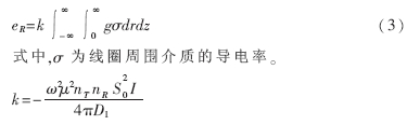 在發(fā)射頻率不高、介質(zhì)導(dǎo)電率較小的條件下,可忽略電磁波傳播效應(yīng)和渦流損耗,用幾何因子理論對接收線圈中的二次感應(yīng)電動勢進(jìn)行計算,將同軸于z的兩線圈周圍介質(zhì)中的感應(yīng)渦流分割成以探頭軸心為圓心、半徑為r、距線圈T和R距離分別為ρT和ρR的小單元環(huán)電流。將探頭周圍介質(zhì)看作是均勻無限介質(zhì),把所有的單元環(huán)感生的電動勢疊加在一起得到: