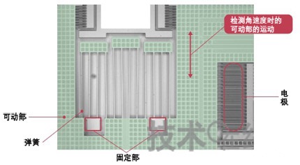 新傳感器由MEMS中常見的固定部、可動部、連接固定部與可動部的彈簧,以及檢測可動部運動的電極構成。利用電極靜電容量隨著可動部的運動而發(fā)生變化的特性來檢測角速度和加速度(圖2)。檢測角速度的電極只有在彎道等使車輛轉向時才檢測信號。