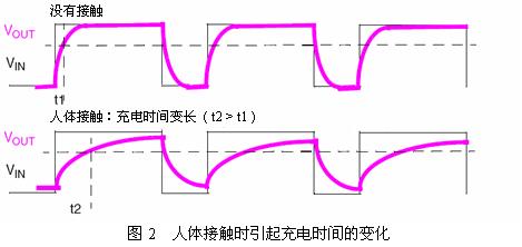 如圖1(a)所示,在RC網(wǎng)絡(luò)施加周期性充電電壓Vin,測(cè)量Vout會(huì)得到如(b)的時(shí)序,通過(guò)檢測(cè)充電開(kāi)始到Vout到達(dá)某一門限值的時(shí)間tc的變化,就可以判斷出是否有人體接觸。圖2顯示出有人體接觸時(shí)充電時(shí)間會(huì)變長(zhǎng)。