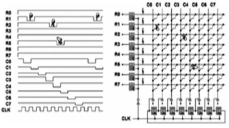 如圖8 所示,8×8 數(shù)字電阻觸摸屏, 基于Altera 解決方案[1]:它采用兩層ITO 分別作為水平的sensing line(觸摸感測線)和垂直的driving line(加電驅(qū)動線),driving line 和sensing line 之間的觸點就相當于一個開關,在未接觸時,它們之間是絕緣的,而接觸發(fā)生后,兩者發(fā)生短路,相當于開關閉合。驅(qū)動的時候,其中sensing line 通常由一個上拉電阻施加高電平,同時在driving line 上以一定頻率依次在各列中施加負脈沖電壓,這樣當掃描到觸點所在的那一列時,由于觸點開關閉合,形成直流通路,使得觸點所在行的電壓被拉低,形成一個負脈沖,這樣就檢測到了觸點的位置。由于driving line 是依次掃描,所以可以檢測到多個觸點的位置。