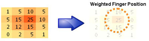 當感測到的電容減去基準值時,就得到一個訊號值陣列,代表圖3所示的手指觸碰狀況。有許多種方法可根據(jù)這項資訊來判斷手指的位置,其中最簡單的方法是計算質(zhì)心--質(zhì)量中心(Centriod),計算出一維或二維軸向感測數(shù)值的加權(quán)平均值。運用一維質(zhì)心計算法,根據(jù)上述例子的X軸數(shù)據(jù),可算出(5×1+15×2+25×3+10×4)/(5+15+25+10)=150/55= 2.73。接著以液晶螢幕的解析度為標準,將這個位置值適當?shù)乜s放,以便和螢幕重疊。若ITO感測器的圖案超出液晶螢幕的邊緣,則必須進行一些轉(zhuǎn)換計算。