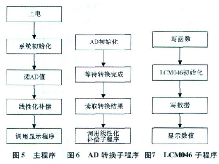 軟件設(shè)計主要包括A /D 轉(zhuǎn)換程序和LCM 046 數(shù)據(jù)顯示兩部分。另外還有非線性補(bǔ)償部分, 在線性不好的情況下可以采用插值法進(jìn)行必要的線性補(bǔ)償。軟件流程圖設(shè)計如圖5、圖6、圖7所示。