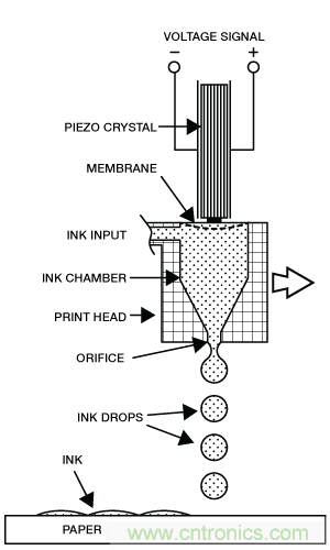 許多商用和工業(yè)用噴墨打印機(jī)使用基于MEMS技術(shù)的打印機(jī)噴頭,保持這些墨滴并在需要時(shí)精確地放下這些墨滴——這一技術(shù)被稱為按需投放(DoD)。墨滴放置在橫跨壓電材料(比如 lead zirconatetitanate,)組成的元件中,通過施加的電壓來進(jìn)行擠壓。這增加了打印頭墨水室的壓力,通過施力形成一個(gè)非常小量(相對壓縮)的墨水,并從噴嘴中噴出。