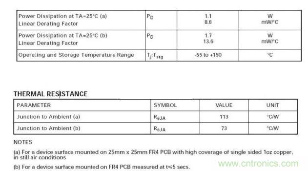 芯片的spec上一般都有耗散功率這個(gè)參數(shù)。比如芯片ZXT10P20DE6,它的datasheet中有以下參數(shù):