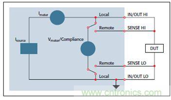圖2:SMU儀器作為恒流源和伏特計的配置,用于測量DUT的響應(yīng)