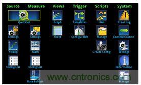 吉時利2450型交互式數(shù)字源表SMU儀器簡化了非傳統(tǒng)用戶的學(xué)習(xí)曲線,使之從使用多層菜單結(jié)構(gòu)和多功能按鈕配置功能的繁瑣工作中解脫出來。2450型儀器使用基于圖標(biāo)的平面菜單系統(tǒng),就像在智能消費電子產(chǎn)品中使用的菜單系統(tǒng)一樣簡單,如平板電腦或智能手機上顯示的應(yīng)用圖標(biāo)排列。