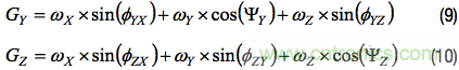 對(duì)準(zhǔn)誤差還會(huì)對(duì)各軸產(chǎn)生跨軸影響。為了量化這些影響,需要將各軸的對(duì)準(zhǔn)角度誤差分解為與其它兩軸相關(guān)的兩個(gè)分量。例如,ΨX有一個(gè)y軸分量(φXY)和一個(gè)z軸分量(φXZ),導(dǎo)致x軸陀螺儀對(duì)繞全局坐標(biāo)系中所有三軸旋轉(zhuǎn)(ωX, ωY, ωZ)的響應(yīng)擴(kuò)展如下:
