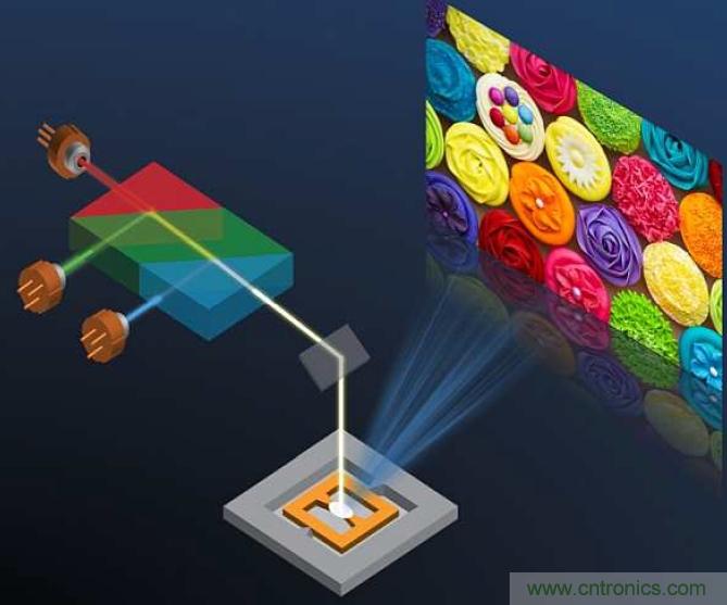 MicroVision公司的嵌入式解決方案采集和處理來自數據源的信號,用于對單個像素的顏色混合和布局進行控制和同步。通過改變每個激光光源的強度,可以形成一個顏色漸變的完整調色板。微型投影儀中的MEMS 掃描鏡將光束導向投影表面就是一個很好的例子(圖11)。