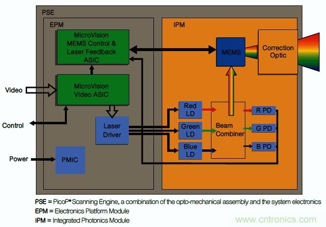圖9:顯示引擎與視頻和MEMS驅動電路集成在一起。這種系統(tǒng)形成了PicoP掃描引擎。