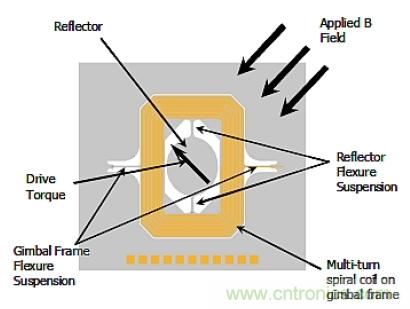 圖2:MEMS鏡組件中有一個反射鏡懸浮在常平架(Gimbal Frame)內,常平架上有一個 微加工的通電線圈。MEMS裸片周圍安裝有永磁體,用于提供磁場。只要給MEMS線圈 施加一個電流,就能在常平架上產生一個磁力扭矩,并沿旋轉軸的兩個方向產生分量。