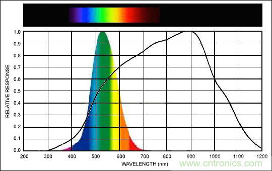 這里還存在一個(gè)更細(xì)微的問題。具體而言,理想情況下,應(yīng)確保環(huán)境光的測(cè)量模擬了人眼對(duì)光線的響應(yīng)機(jī)制。這通常借助CIE提供的視覺亮度曲線(圖3)。然而,光電二極管很少能夠完全模擬這種響應(yīng)機(jī)制,因?yàn)樗鼈兺ǔ>哂泻芨叩募t外(IR)靈敏度。在IR強(qiáng)度較大的光照條件(譬如白熾燈或日光)下,這種紅外靈敏度會(huì)造成錯(cuò)誤地判斷光線強(qiáng)度。