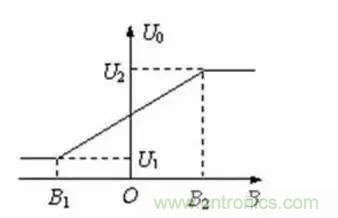 由霍爾元件、線性放大器和射極跟隨器組成,它輸出模擬量。輸出電壓與外加磁場強(qiáng)度呈線性關(guān)系,如下圖所示,在B1~B2的磁感應(yīng)強(qiáng)度范圍內(nèi)有較好的線性度,磁感應(yīng)強(qiáng)度超出此范圍時(shí)則呈現(xiàn)飽和狀態(tài)。