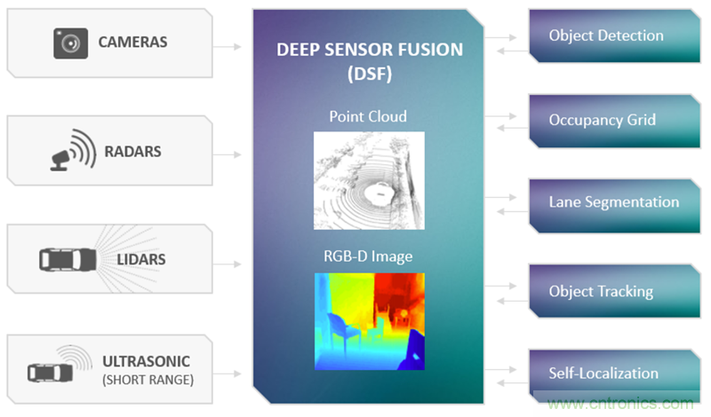 DeepScale公司開發(fā)了一種感知技術,可以采集原始數(shù)據(jù),而不是對象數(shù)據(jù),可以在嵌入式處理器上加速傳感器融合。DeepScale正在利用自己的深度神經(jīng)網(wǎng)絡(DNN)白手起家——其不僅使用了圖像傳感器的原始數(shù)據(jù),還使用了雷達和激光雷達的原始數(shù)據(jù)。