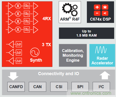 TI的汽車毫米波雷達傳感器將射頻(RF)和模擬功能與數(shù)字控制功能集成到了一個芯片中。(來源:TI)