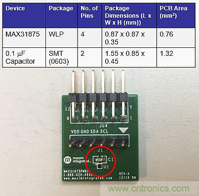 圖2:WLP溫度傳感器(U1/MAX31875)尺寸比SMT的0.1μF電容(C1)小。