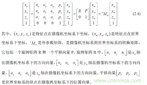 攝像機坐標(biāo)系位于攝像機中心,而世界坐標(biāo)系位于平面棋盤格靶標(biāo)上。一個特征點在攝像機坐標(biāo)系下坐標(biāo)與其在世界坐標(biāo)系下坐標(biāo)之間的對應(yīng)關(guān)系可以用下式來表達(dá):