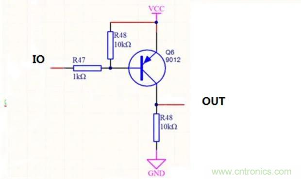 上圖是一個PNP的OC輸出原理圖,和NPN剛好顛倒,它的發(fā)射極E掛到電源VCC上了,只要通電了,IO輸入高電平,則滿足導通條件,OUT和VCC正極連接,OUT也將輸出高電平,當IO輸入低電平,三極管截止,OUT將變成低電平。