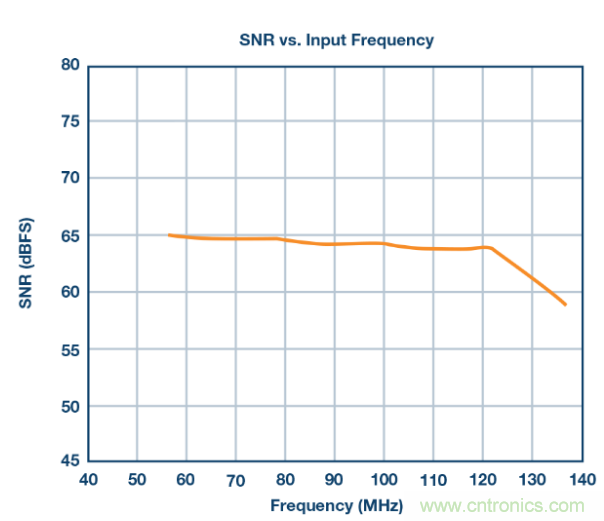 圖3. 采用ADA4927-1驅(qū)動LTC2185的SNR。