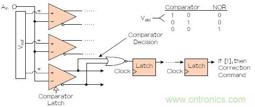 有些設(shè)計(jì)方案可以減輕這個(gè)問(wèn)題。首先,將比較器的不確定范圍設(shè)計(jì)的非常小,迫使比較器在可能的最大模擬輸入條件范圍內(nèi)做出準(zhǔn)確決定。但是,這可能造成電路功率和設(shè)計(jì)尺寸增加。